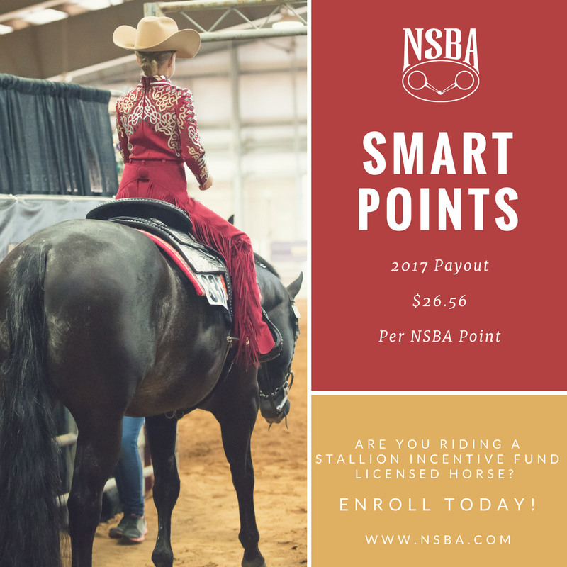 The National Snaffle Bit announced the 2017 payout for Smart Points, their youth scholarship program. Each point earned by enrolled youth riding an NSBA Stallion Incentive Fund (SIF) Licensed horse will earn $26.56 for points earned in 2017. Over $40,000 was earned by Smart Point enrollees in 2017 with the highest graduate earning $2,553.